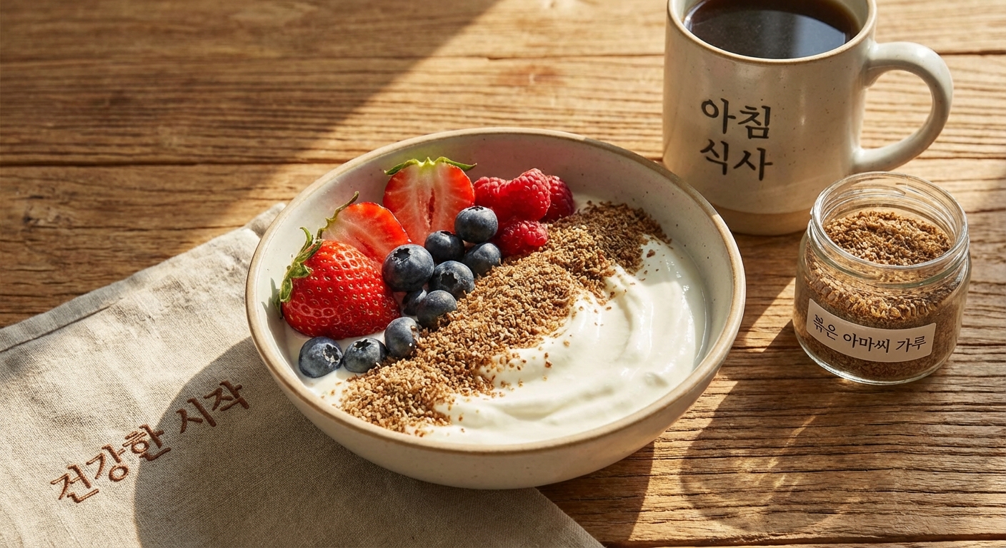 아마씨는 식이섬유가 풍부해 포만감을 줍니다. 식사 30분 전이나 아침 공복에 요거트와 함께 섞어 드시면, 과식을 예방하고 든든한 하루를 시작하는 데 도움이 됩니다.
