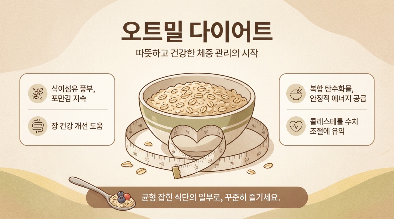 💡 한 문장 결론: 오트밀 다이어트는 정제 탄수화물을 줄이고 복합 탄수화물로 교체하여 건강한 대사 흐름을 만드는 것이 핵심입니다.