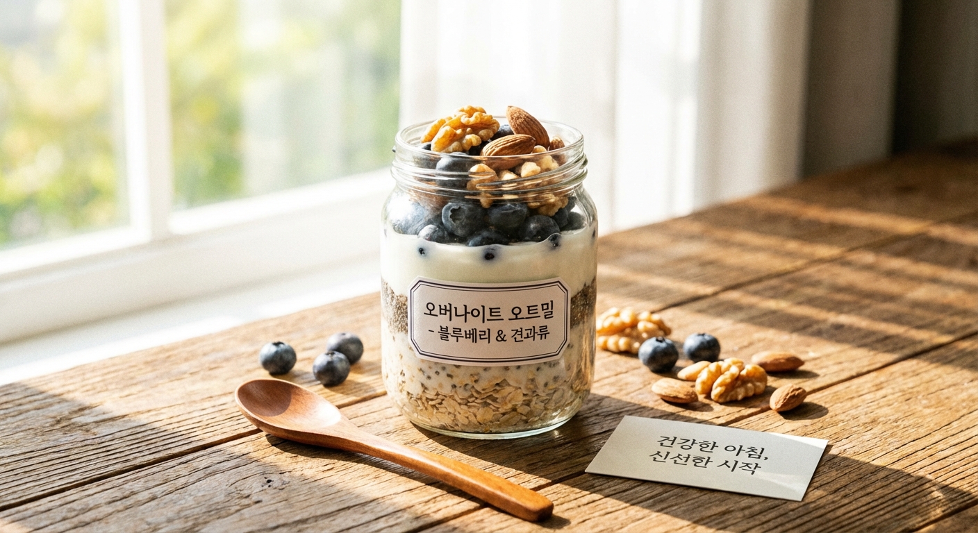 • 방법: 전날 밤, 병에 오트밀과 우유(또는 두유, 아몬드 브리즈)를 1:1 비율로 넣고 냉장 보관합니다. 다음 날 아침 불어난 오트밀에 블루베리나 견과류를 토핑해 바로 먹습니다.