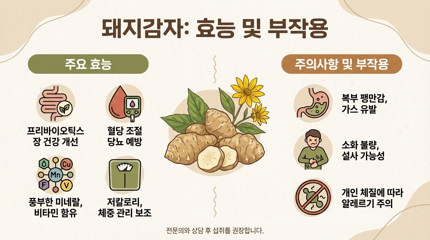 💡 한 문장 결론: 돼지감자는 이눌린이 풍부해 건강한 식단 관리에 유익하지만, 개인의 장 상태와 체질에 맞게 적정량을 섭취해야 하는 식품입니다.