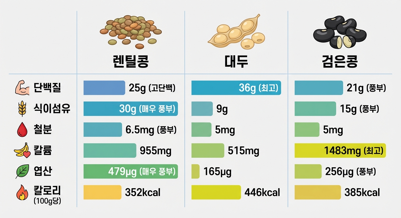 렌틸콩은 우리가 흔히 먹는 대두나 검은콩과 비교했을 때 어떤 영양적 차이가 있을까요?