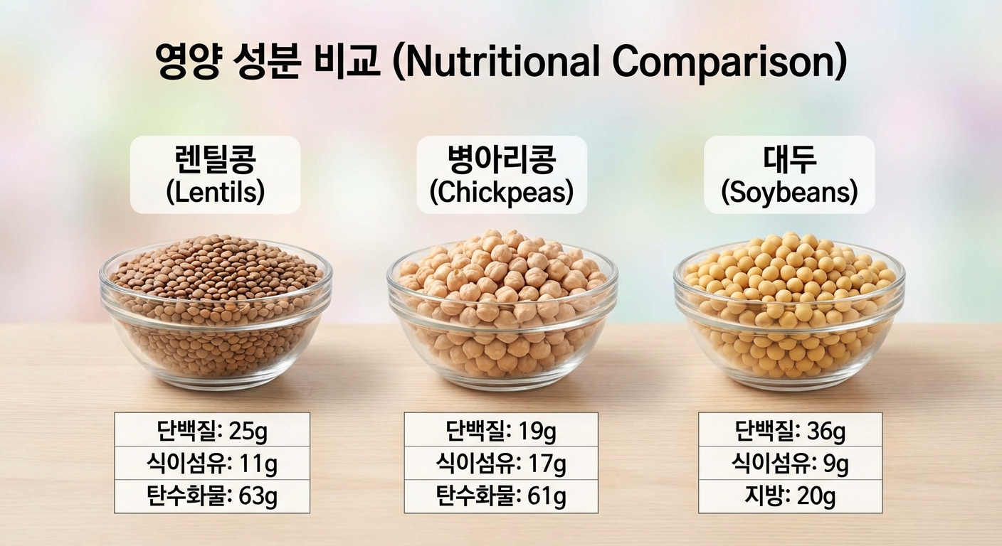 렌틸콩이 우리가 흔히 먹는 다른 대중적인 콩류와 어떤 차이가 있는지 객관적으로 비교해 보겠습니다. 이를 통해 내 몸과 식단에 가장 잘 맞는 콩을 선택할 수 있습니다.
