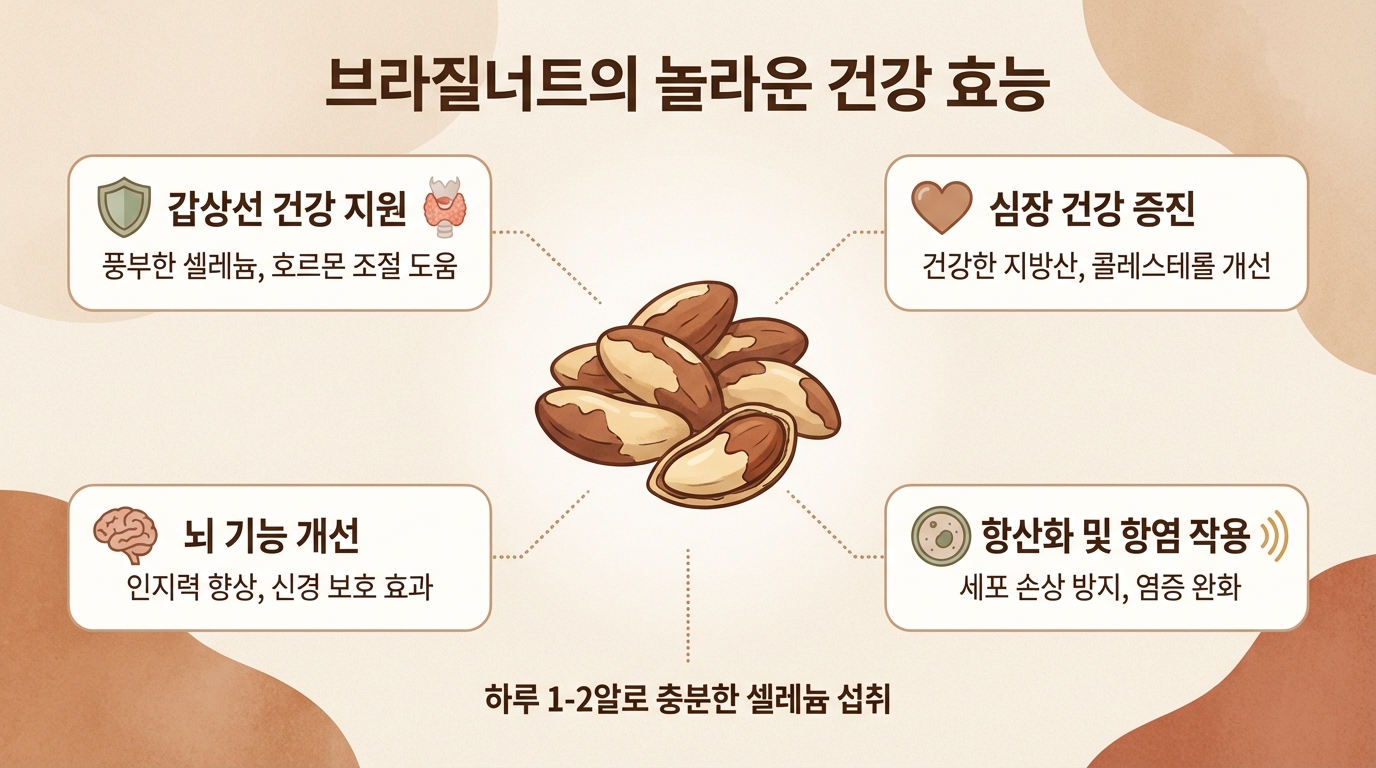 💡 한 문장 결론: 브라질너트는 하루 1~2알로 핵심 미네랄인 셀레늄을 간편하게 채울 수 있는 고효율 자연 식재료입니다.